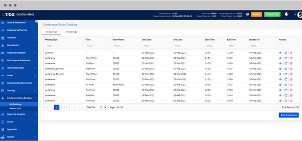 The Conference Room Booking tool enables users to book conference room(s) by logging into Digital HRMS. Depending on their permissions, the user can book a conference room as well as view, edit, or delete bookings.